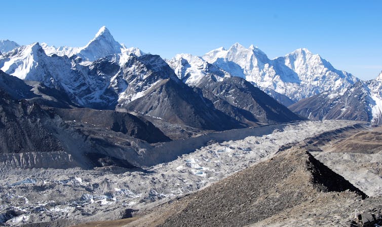 The Himalayas are sacred mountains. Their name in Sanskrit means “abode of snow”. But glaciers are a political issue in central Asia. Glacier-fed rivers provide water to over a billion people for food production and hydropower. India and Nepal in particular rely on glacier melt water to buffer seasonal droughts before the summer monsoon. These countries are rapidly industrialising and generally oppose limiting their carbon emissions.